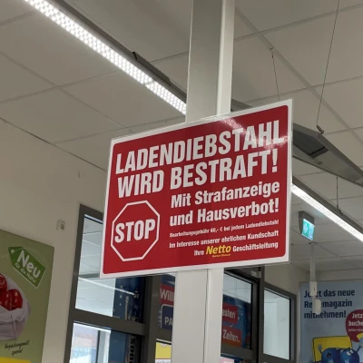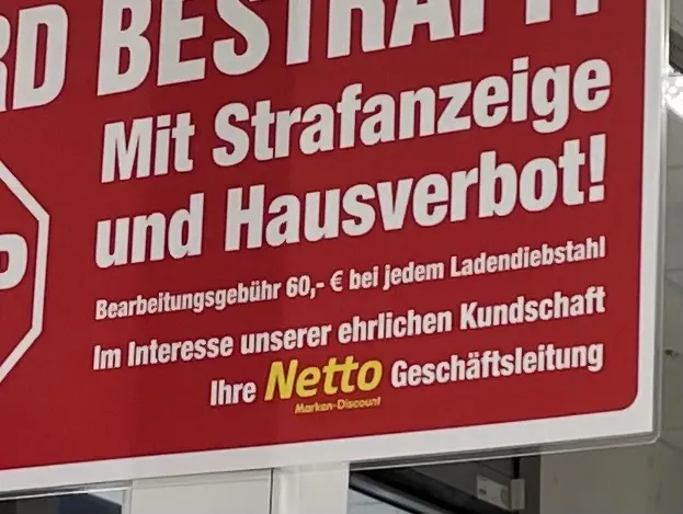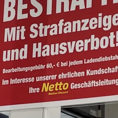 Als Kunde habe ich ja nie einen Vertrag mit Netto abgeschlossen und somit auch diesen Bedingungen zugestimmt. Komisch auch dass auf dem kleinen Schild 100 Euro Strafe festgelegt ist oben aber eine Strafgebühr von 60 Euro angegeben wird.