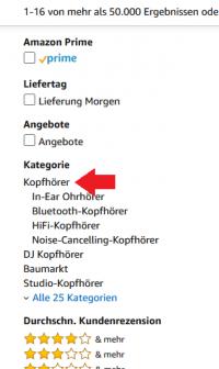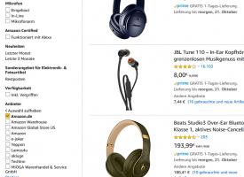 In meinem kleinen Beispiel werde ich nach Kopfhörern suchen, die direkt von Amazon verkauft und versendet werden. Drittanbieter Produkte möchte ich erst gar nicht angezeigt bekommen.