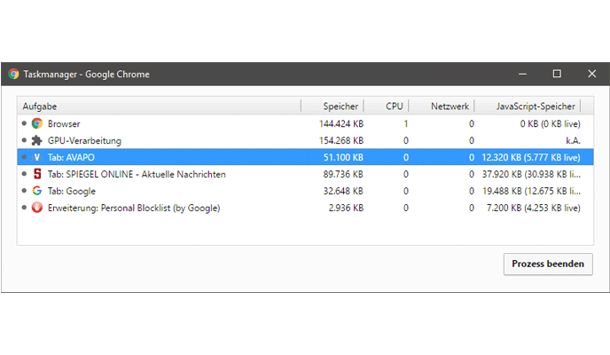 In der Liste werden alle aktuell im Browser geladenen Webseiten aufgeführt und können durch einen Klick auf "Prozess beenden" entfernt werden. So können wir auch Webseiten, die sich anderweitig nicht schließen lassen wollen, sofort beenden.
