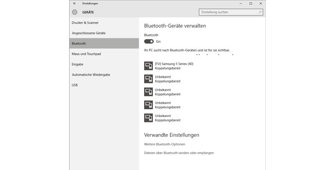 Jetzt müssen wir am Windows 10 PC Bluetooth aktivieren (falls dies noch nicht der Fall war). Dazu einfach in der Windows Suche "Bluetooth" eingeben und in der Auswahlliste "Bluetooth Einstellungen" anklicken. Hier jetzt Bluetooth einschalten und das Android Handy mit dem PC koppeln.