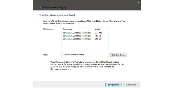 Jetzt noch am Handy unter "Verfügbare Geräte" den Windows PC auswählen und die Übertragung sollte sofort anfangen. Sollte der PC nicht in der Liste der verfügbaren Geräte auftauchen, muss es erst über die Bluetooth Einstellungen sichtbar gemacht werden. Sobald die Übertragung beendet ist, kann man noch festlegen wo die Dateien auf dem PC gespeichert werden sollen.