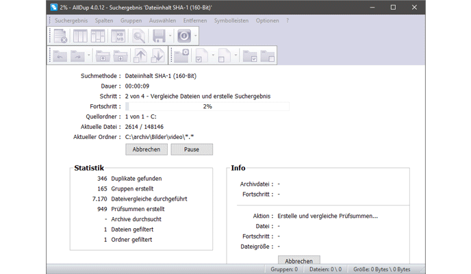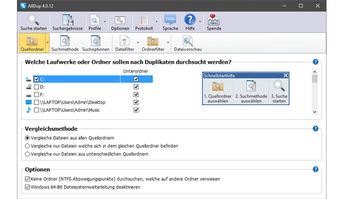 Inzwischen nutze ich ein noch einfacheres Vergleichsprogramm "Duplicate Files Finder" Einloggen für Link das doppelte Dateien schneller als AllDup findet und die doppelten Dateien auch problemlos löscht.