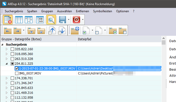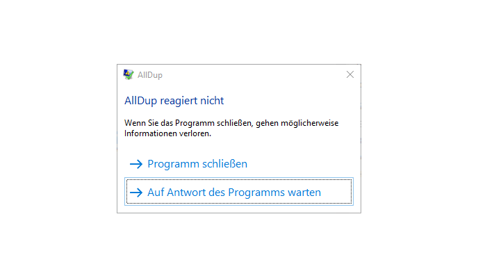 Leider hat sich AllDup in der aktuellen Version als sehr fehlerhaft herausgestellt. Version 4.0.12 findet zwar doppelte Dateien auf der Festplatte, beim Versuch die Dateien dann über AllDup zu löschen stürzt das Programm aber immer ab. Version 4.0.12 scheint nicht mit Windows 10 Version 1511 kompatibel zu sein. Schade.