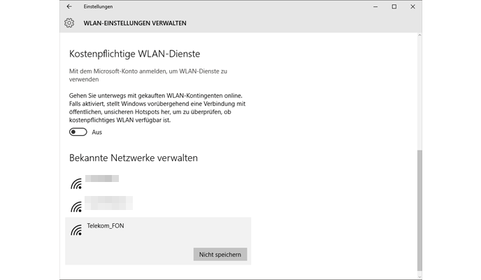 Einstellungen > Netzwerk und Internet > WLAN > WLAN-Einstellungen verwaltenBekannte Netzwerke in Windows 10 verwalten