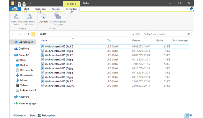 Wie man sieht werden sofort alle 10 Dateien zusammen umbenannt, wobei das erste Foto "Weihnachten 2015 (1)" benannt wird und das letzte entsprechend "Weihnachten 2015 (10)".