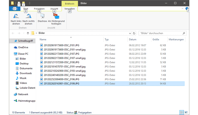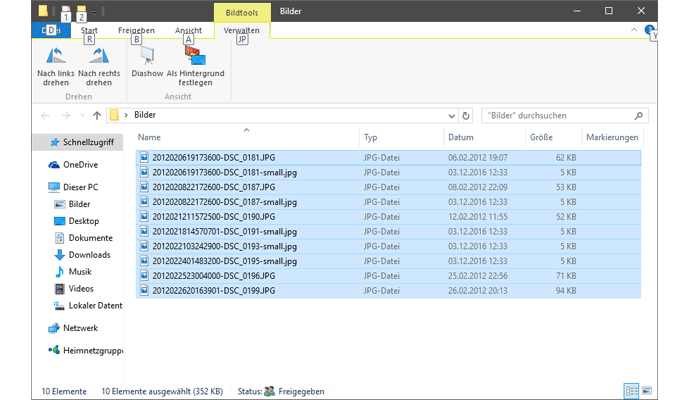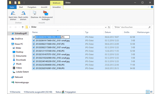 Dazu markiere ich zunächst alle 10 Dateien, indem ich mit der Maus im Explorer einen Rahmen um sie ziehe und dann die Taste loslasse. Alternativ kann man auch die erste Datei anklicken, die Shift-Taste auf der Tastatur halten und anschließend die letzt Datei in der Liste anklicken, um alle 10 Dateien zu markieren. Sind alle Dateien markiert (blauer Hintergrund) mache ich einen Rechtsklick auf die erste Datei in der Liste und wähle umbenennen aus dem Kontextmenü. Jetzt gebe ich als neuen Dateinamen "Weihnachten 2015" ein und bestätige.