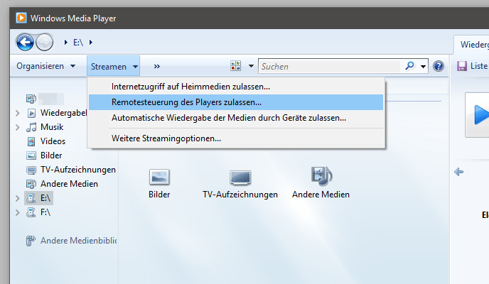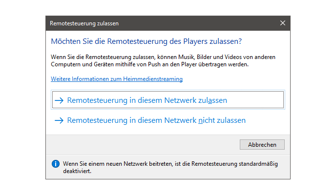 Wir klicken in der Menüleiste oben auf "Streamen" und wählen "Remotesteuerung des Players zulassen". Im daraufhin erscheinenden Dialog klicken wir auf die Option "Remotesteuerung in diesem Netzwerk zulassen".