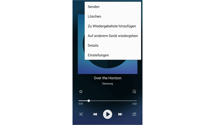 Jetzt ist der WMP fertig eingerichtet um Musik und Videos von eurem Android Handy abspielen zu können. Auf dem Handy öffnen wir jetzt die Musik App (in unserem Fall die Samsung App), wählen den abzuspielenden Titel aus und tippen dann oben rechts auf "MEHR".