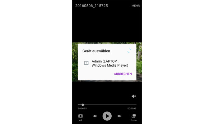 Jetzt noch unten links auf "Anzeigen auf" tippen und den Windows PC aus dem folgenden Dialog auswählen. Schon sollte der WMP das Video auf deinem PC abspielen.