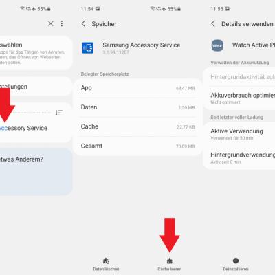![]() #039;ungeordneteListe'><li><div><p>Galaxy Wearables App</p></div></li><li><div><p>Samsung Accessory Service</p></div></li><li><div><p>Watch Plugin</p></div></li><li><div><p>Watch Active Plugin - falls vorhanden</p></div></li></ul><p>Öffnet also zunächst die App Liste und sucht eine nach der anderen genannten App. Habt ihr eine App gefunden leert ihr ihren Cache im Bereich "Speicher" und stellt im Bereich Akku sicher, dass "Akkuverbrauch optimieren" auf "Nicht optimieren" eingestellt ist.</p>' data-media-title='Schritt 2: Cache der zugehörigen Apps leeren und Akkueinstellungen überprüfen' data-media-type='imagePopup' data-width='3240' data-height='2280' data-popup='https://static.antwort.net/img/galaxy-watch-accessoire-cache-leeren-855.png' src='https://static.antwort.net/images/1px-trans.png' title='Schritt 2: Cache der zugehörigen Apps leeren und Akkueinstellungen überprüfen' class='image-preview-step image-popup-rich'> #039;ungeordneteListe'><li><div><p>Galaxy Wearables App</p></div></li><li><div><p>Samsung Accessory Service</p></div></li><li><div><p>Watch Plugin</p></div></li><li><div><p>Watch Active Plugin - falls vorhanden</p></div></li></ul><p>Öffnet also zunächst die App Liste und sucht eine nach der anderen genannten App. Habt ihr eine App gefunden leert ihr ihren Cache im Bereich "Speicher" und stellt im Bereich Akku sicher, dass "Akkuverbrauch optimieren" auf "Nicht optimieren" eingestellt ist.</p>' data-media-title='Schritt 2: Cache der zugehörigen Apps leeren und Akkueinstellungen überprüfen' data-media-type='imagePopup' data-width='3240' data-height='2280' data-popup='https://static.antwort.net/img/galaxy-watch-accessoire-cache-leeren-855.png' src='https://static.antwort.net/images/1px-trans.png' title='Schritt 2: Cache der zugehörigen Apps leeren und Akkueinstellungen überprüfen' class='image-preview-step image-popup-rich'>- Schritt 2: Cache der zugehörigen Apps leeren und Akkueinstellungen überprüfen- Im zweiten Schritt müssen wir für die Apps, die eine Kommunikation zwischen Handy und Watch ermöglichen, einige Schritte unternehmen. Die Apps sind folgende - Galaxy Wearables App