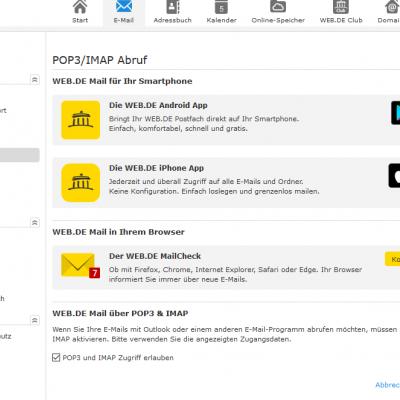 Jetzt müsst ihr unten, im Bereich WEB.DE Mail über POP3 & IMAP das kleine Häkchen setzen und auf Speichern tippen. Nun ist der Abruf eurer web.de Mails über externe E-Mail Clients aktiviert und ihr könnt euch wieder ausloggen und den Browser schließen.