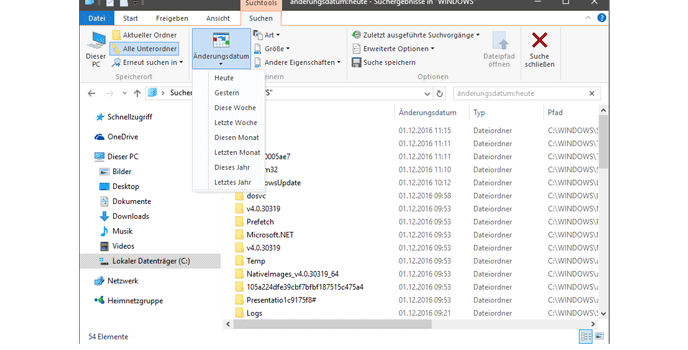 Wenn wir uns aber für einen bestimmten Zeitraum interessieren, gibt es eine einfache Methode um Dateien, die in einem bestimmten Zeitraum geändert oder erstellt wurden, zu finden. Dazu geben wir im Suchfeld oben rechts ein