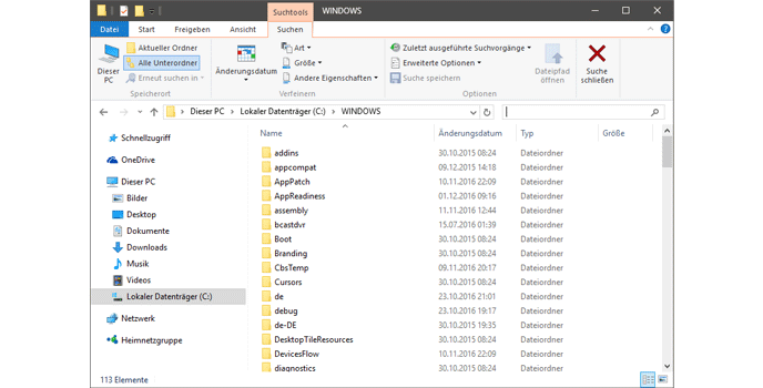 Navigieren wir zum Beispiel in unser Windows Verzeichnis und wählen die Option "Änderungsdatum: Diese Woche" werden alle Dateien im Windows Verzeichnis und Unterverzeichnissen geliefert, die in den letzten 7 Tagen verändert wurden.